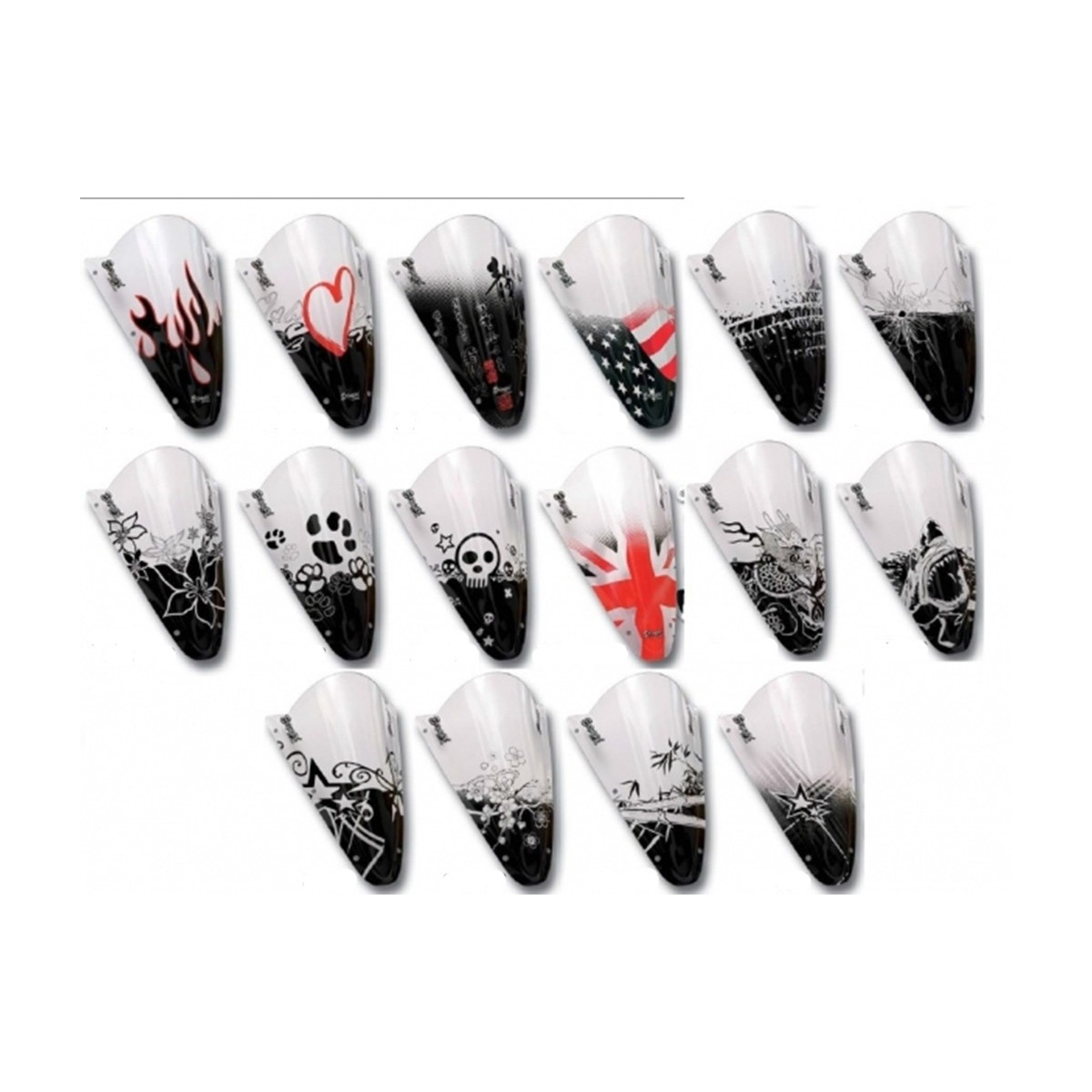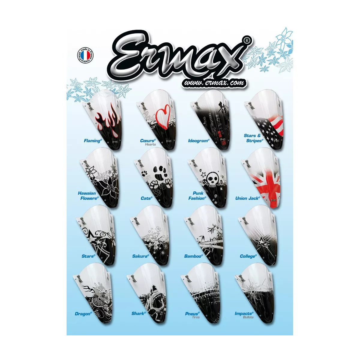Ermax nous propose une liste de sérigraphies pour personnaliser votre bulle, saute-vent ou pare-brise ERMAX