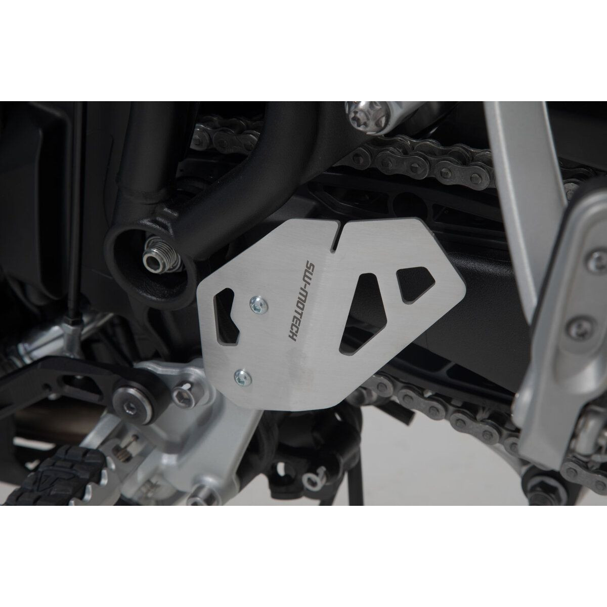 Set de protection spécifique SW MOTECH pour Triumph Tiger 900 2019 et +. Il comprend les éléments suivants : Protection de collecteur d'échappement, Protection de chaîne et Protège-talon.